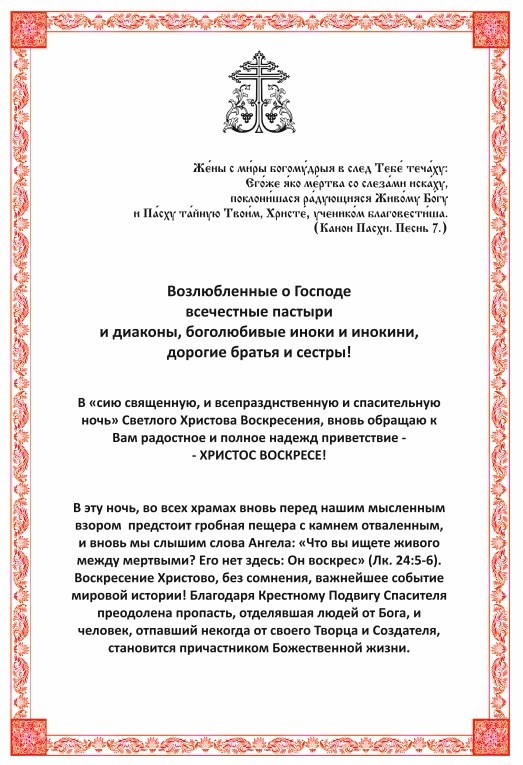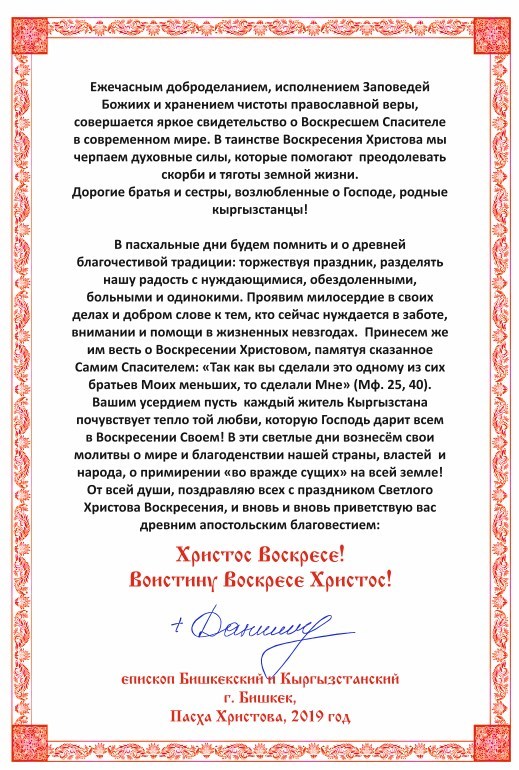 Пасхальное послание епископа Бишкекского и Кыргызстанского Даниила пастырям, диаконам, монашествующим и всем верным чадам Бишкекской и Кыргызстанской епархии