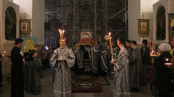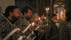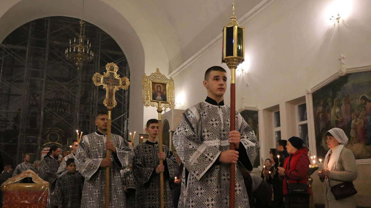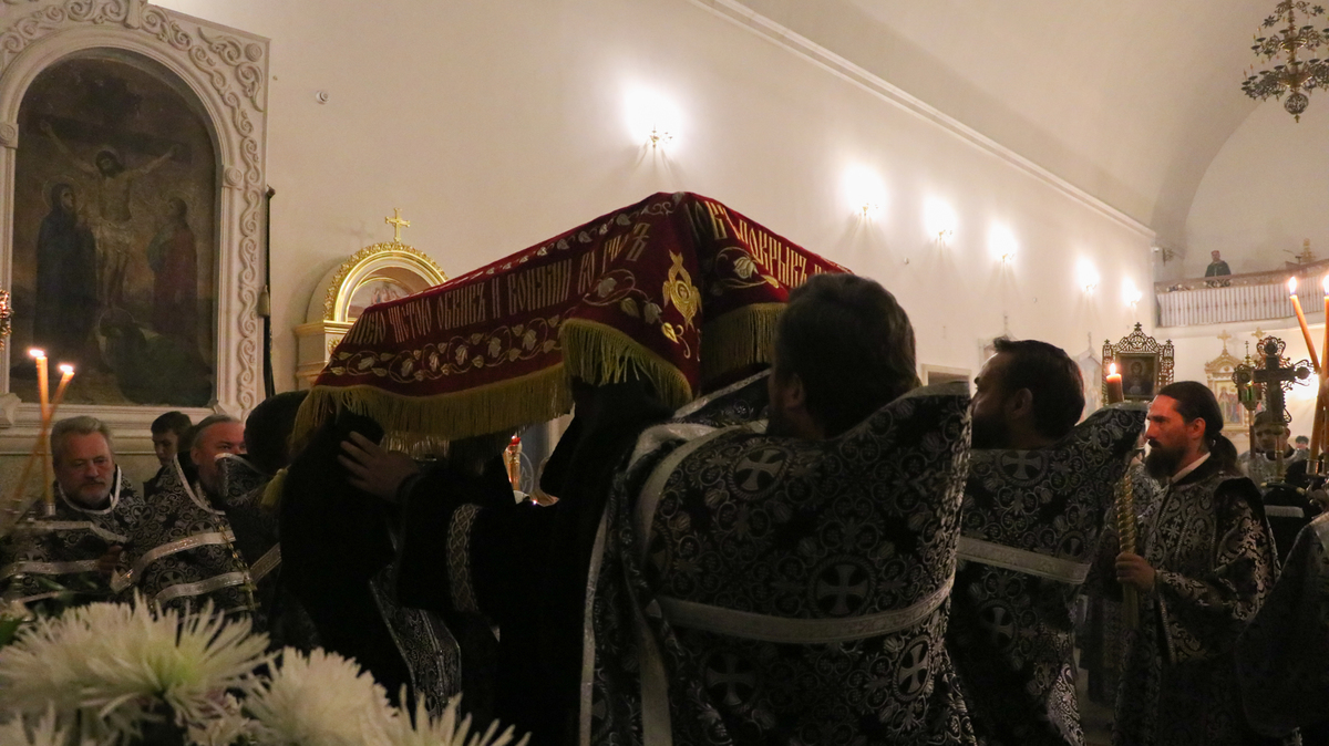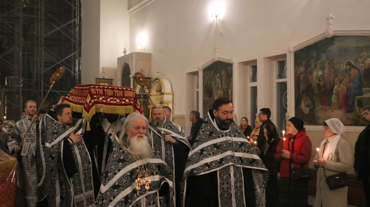 После великого славословия с пением погребального гимна «Святый Боже» был совершен крестный ход с Плащаницей вокруг собора.