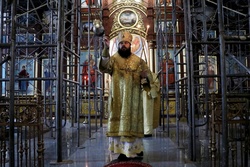 «Дорогие братия и сестры, в нашем соборе, по благословению Святейшего Патриарха Московского и всея Руси Кирилла, пребывает образ «Спас Нерукотворный». Эта святыня путешествует по всем городам России и стран СНГ, где находятся российские военные части и военные базы. Сия икона после Свято-Воскресенского кафедрального собора также побывает в Канте, Караколе и Чалдоваре – в местностях, где находятся и трудятся наши воины, защищают наш мир и спокойствие. Далее эта святыня после 12 сентября отправится дальше в Россию, чтобы укреплять в православной вере и благословлять воинов на священное служение нашему Отечеству. После того, как образ объедет все воинские части РФ, он будет постоянно находиться в большом воинском соборе в Подмосковье, который сейчас строится. Надеюсь, что сия святыня, уже намоленная в разных городах, будет служить для утешения и спокойствия. Молимся о том, чтобы не возникло страшной ситуации, чтобы возить эту святыню по действующим воинским частям во время конфликтных военных действий. Дай Бог, чтобы этого не случилось, и дай Бог, чтобы сей образ служил для мира и спокойствия в России и во всем мире. Потому что в настоящее время есть много людей, которые хотят и желают кровопролития и беспорядков. Хотят чтобы была война и люди погибали. В основном эти люди хотят зарабатывать на войне. Это безумие, в котором действует дьявол. Но Господь наш призывает к миру. Сын Человеческий пришел на землю для того, чтобы мир и согласие были на земле, чтобы Господь – который есть любовь, пребывал в сердцах человеческих».