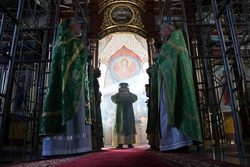 По окончании Литургии Преосвященнейший владыка совершил славление и прочитал молитву перед ракой с мощами преподобного Ираклия Иссык-Кульского.