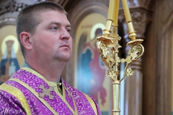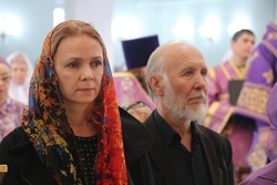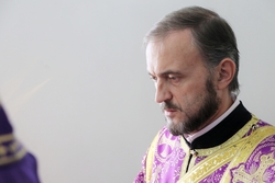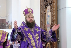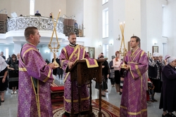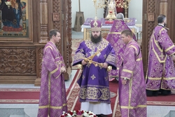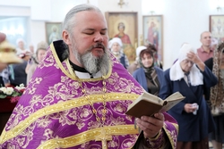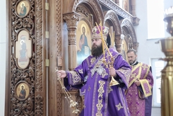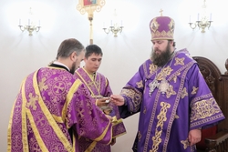Его Преосвященству сослужили: протоиерей Валентин Никонов, протоиерей Алексей Сыромятников, настоятель Владимирского собора протоиерей Алексей Зайцев, иерей Георгий Дворовой.