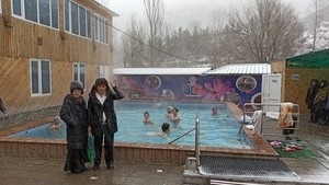 Находясь в благодатном впечатлении от праздника, паломники отправились в горный санаторий Иссык-Ата. Не смотря на то, что шел снег, желающих искупаться в горячем минеральном источнике было много. Всё радовались как дети. Ну а детки – двухгодовалый Кирилл и восьмилетняя Руфина, были просто счастливы. Кто не купался, достали свои термоса с горячим чаем, пирожками и, угощая друг друга, знакомились, узнавая друг друга ближе в общении.