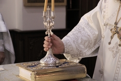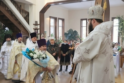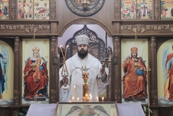Затем Его Преосвященство обратился к прихожанам с архипастырским словом, в котором поздравил духовенство и прихожан с престольным праздником. «Сегодня день ангела у каждого человека. Как есть день всех святых и отдельные дни наших святых покровителей, так есть и день, когда мы прославляем все Небесные силы. Когда мы стоим перед святыми образами, перед Богом, мы возносим молитвы в утренних и вечерних правилах. Мы знаем, что там всегда есть небольшие молитвы к Ангелу-Хранителю, которого мы просим о здравии телесном и вечном спасении. Сегодня, в этом святом храме мы собрались для того, чтобы прославить Архангела Михаила и всех наших Небесных покровителей и защитников, а также испросить у них великих милостей Божьих, которые всегда в изобилии изливаются над нами. Все Небесные силы хранят нашу Землю и всю Вселенную, нашу страну, наш народ и каждого из нас. Слава Богу, что Божьим промыслом до сотворения Неба и Земли были сотворены и Небесные силы и воинства. И их задачей являлась помощь роду человеческому. Господь промыслом Своим устроил, чтобы Архангелы , Ангелы-Хранители и прочие силы Небесные помогали нам в деле спасения для жизни вечной. Чтобы они нас оберегали, хранили и наставляли в делах праведных». По завершении слова, владыка поблагодарил священников, диаконов, иподиаконов, певчих и прихожан за участие в соборном служении, отдельно поблагодарил настоятеля храма иерея Александра Пелина за труды на Божьей ниве. Пожелал всем здравия, Божьей помощи, милости и крепости. В ответном слове настоятель храма также поблагодарил владыку за совершенную литургию в честь престольного праздника, отметив его пастырскую заботу и попечение.