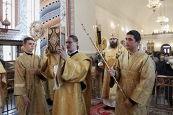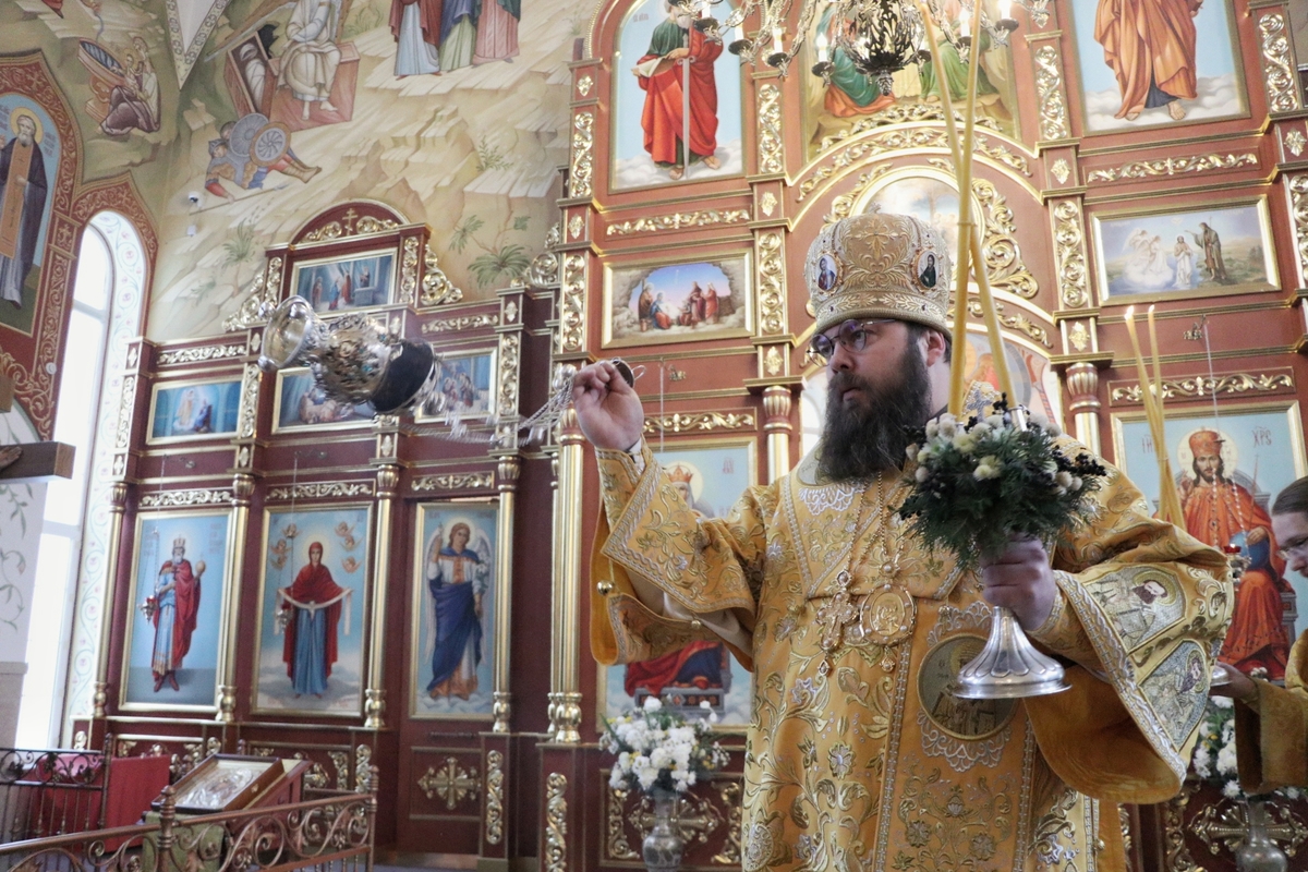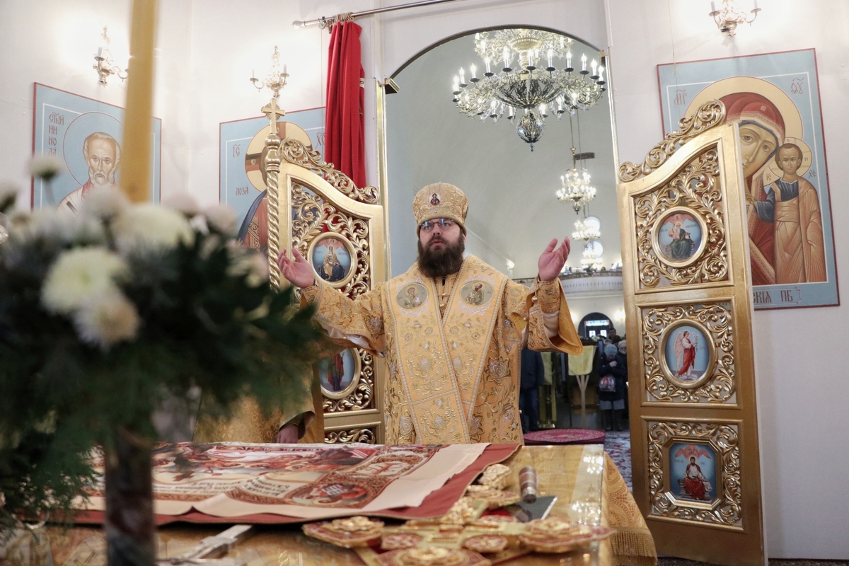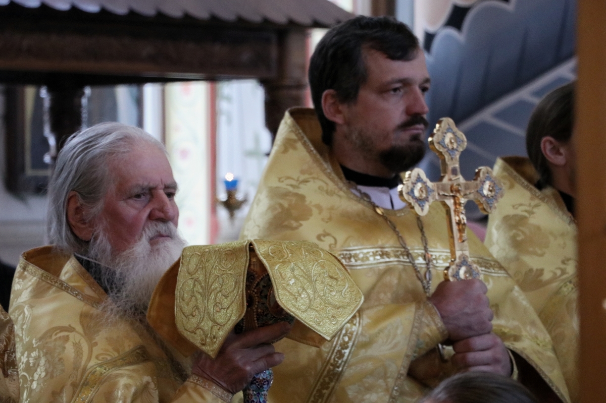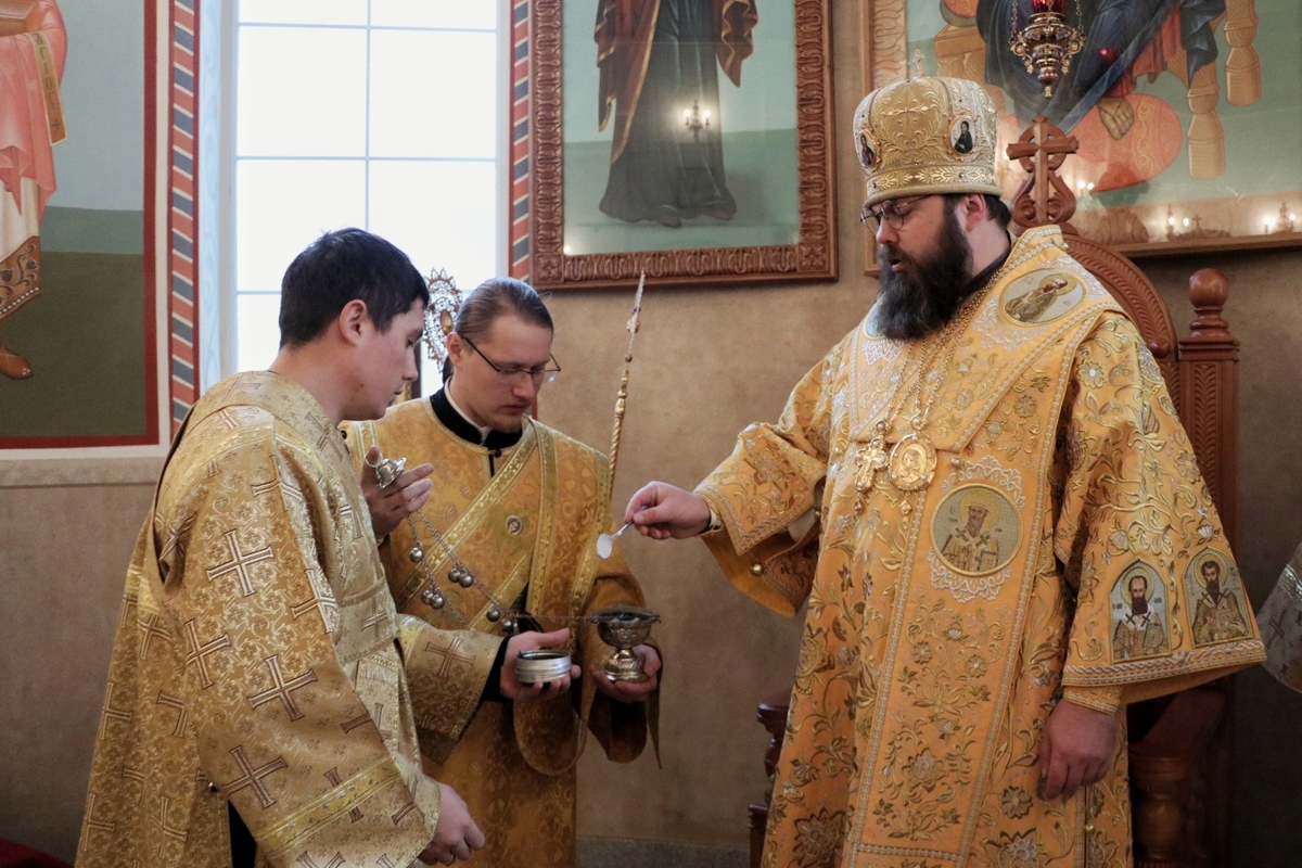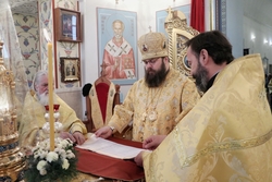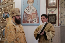 Его Преосвященству сослужили: митрофорный протоиерей Валентин Никонов, архимандрит Петр (Путиев), иерей Георгий Дворовой, иерей Илия Меляков.