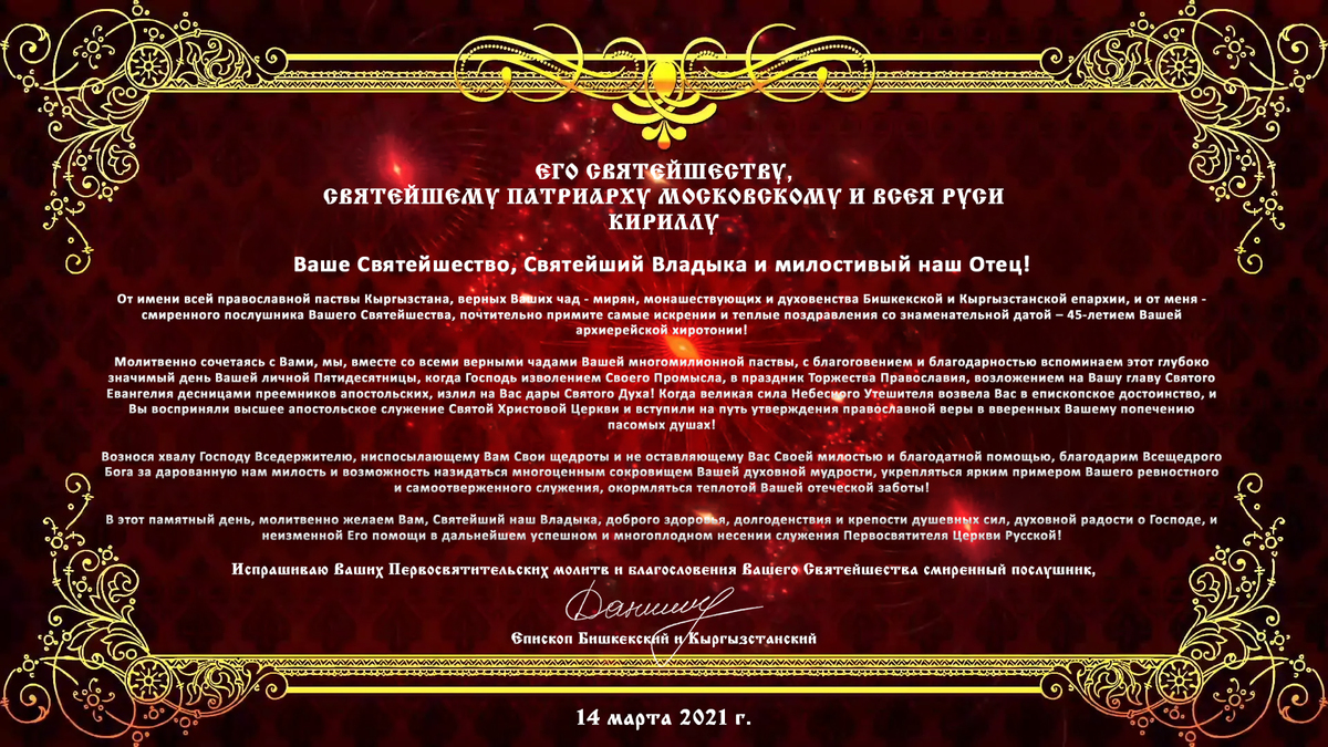 От имени всей православной паствы Кыргызстана, верных Ваших чад - мирян, монашествующих и духовенства Бишкекской и Кыргызстанской епархии, и от меня - смиренного послушника Вашего Святейшества, почтительно примите самые искрении и теплые поздравления со знаменательной датой – 45-летием Вашей архиерейской хиротонии!