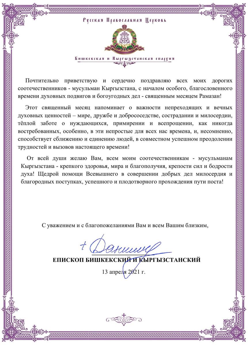Епископ Даниил поздравил мусульман Кыргызстана с началом Рамазана