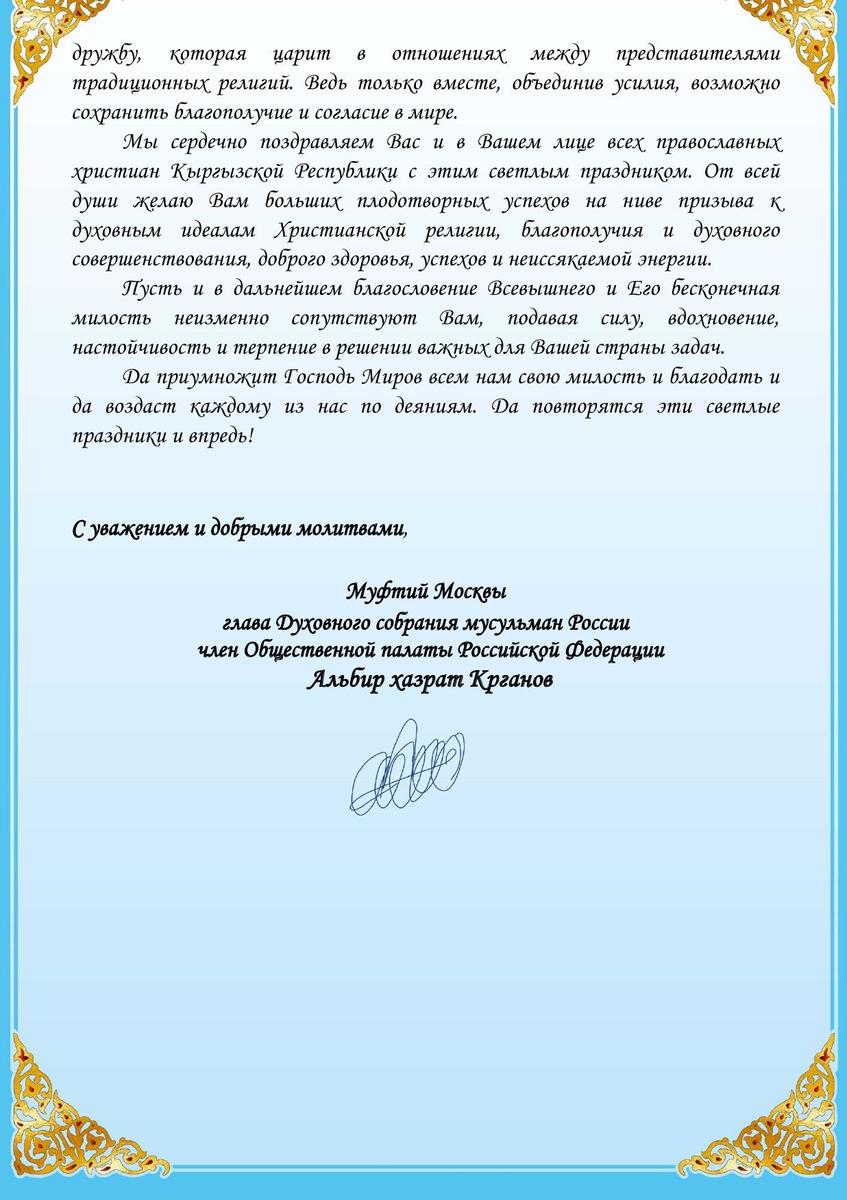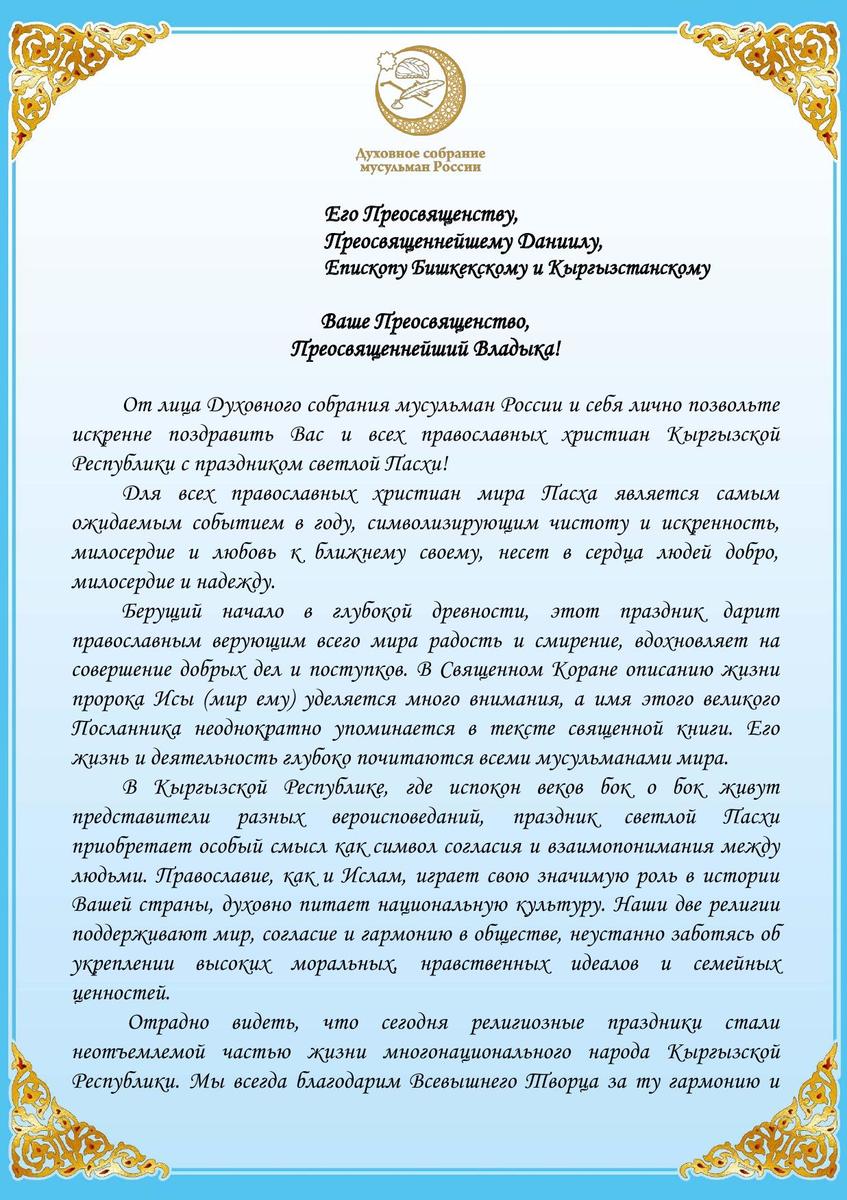 Глава Духовного собрания мусульман России, муфтий Альбир хазрат Крганов, поздравил владыку Даниила и всех православных христиан Кыргызстана с Пасхой