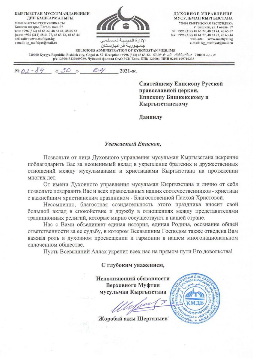 Глава Духовного собрания мусульман России, муфтий Альбир хазрат Крганов, поздравил владыку Даниила и всех православных христиан Кыргызстана с Пасхой