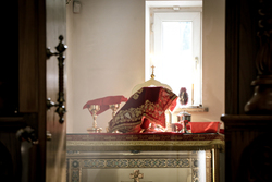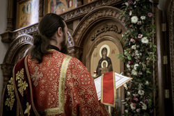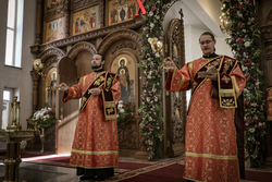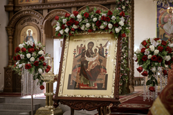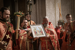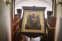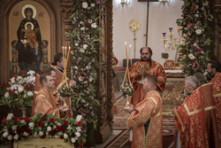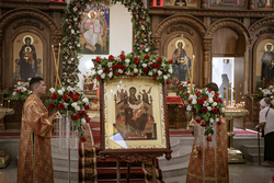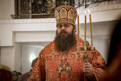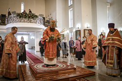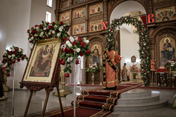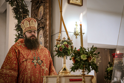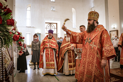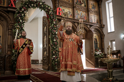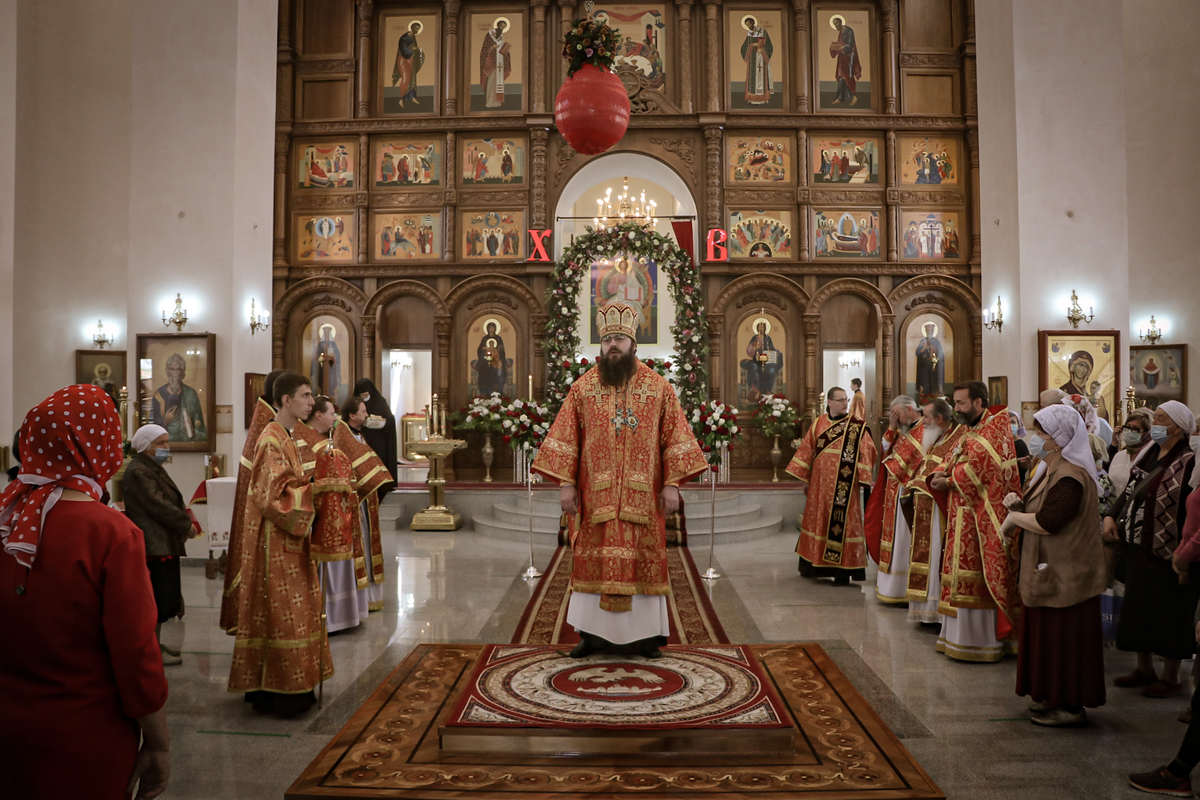 Архиерей приветствовал сослужащее духовенство и мирян и поздравил их со светлым праздником Пасхи Христовой. В своем обращении владыка Даниил обратил внимание на привезенный в собор список чудотворной иконы Божией Матери «Всецарица».