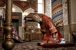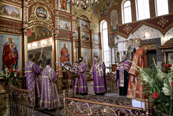 На утрене во время великого славословия, из алтаря для молитвенного поклонения верующих был изнесен Крест Господень.