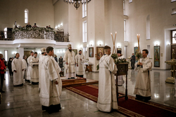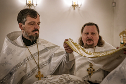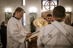 Его Преосвященству сослужили: ключарь Свято-Воскресенского кафедрального собора архимандрит Петр (Путиев), настоятель Владимирского собора протоиерей Андрей Кунавин,
