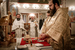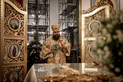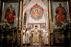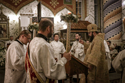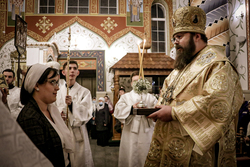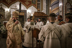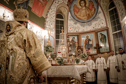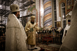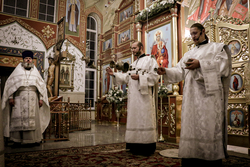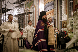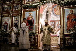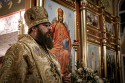 За праздничной Литургией Его Преосвященству сослужили: ключарь Свято-Воскресенского кафедрального собора архимандрит Петр (Путиёв), клирики собора - иерей Георгий Дворовой, иерей Илия Меляков, иерей Андрей Андреев.