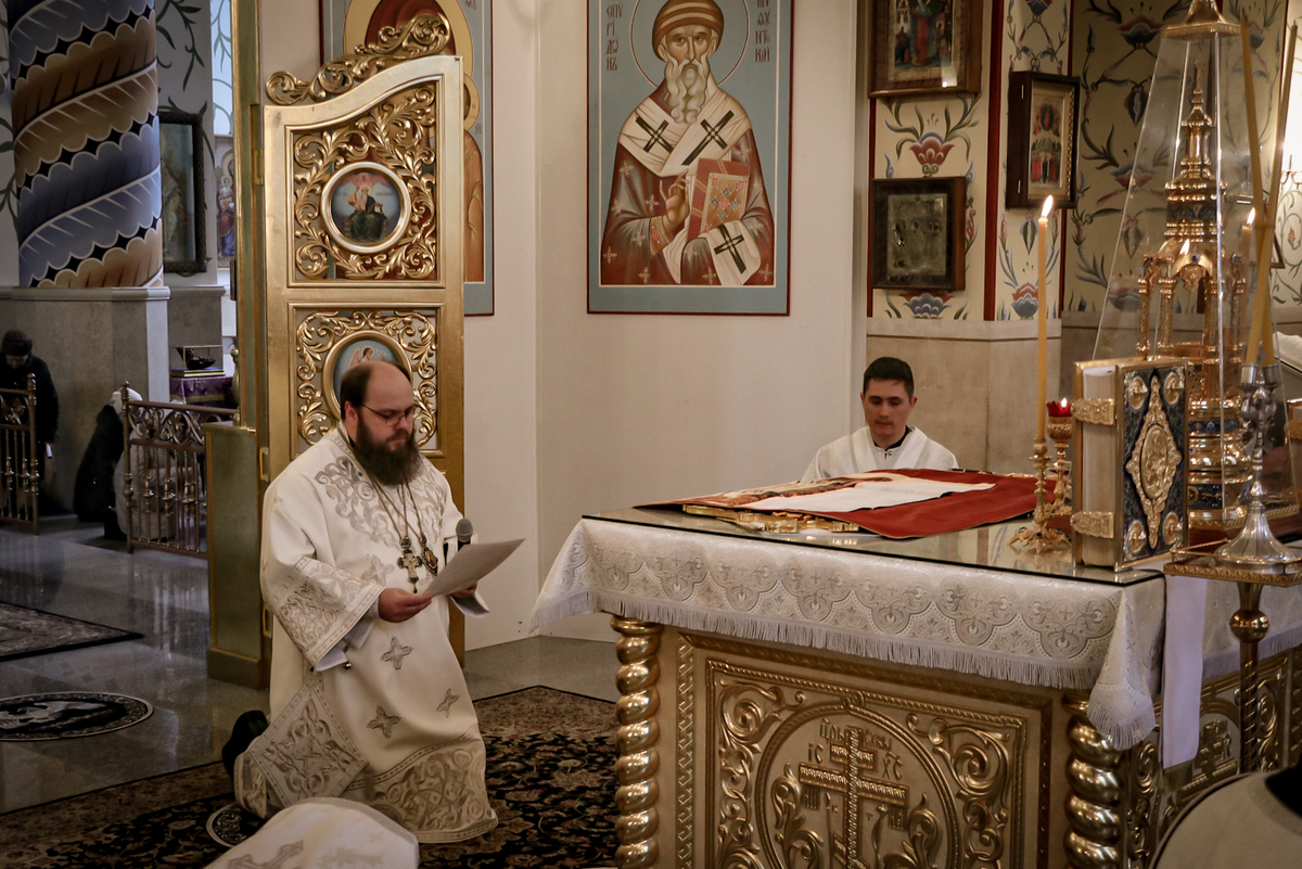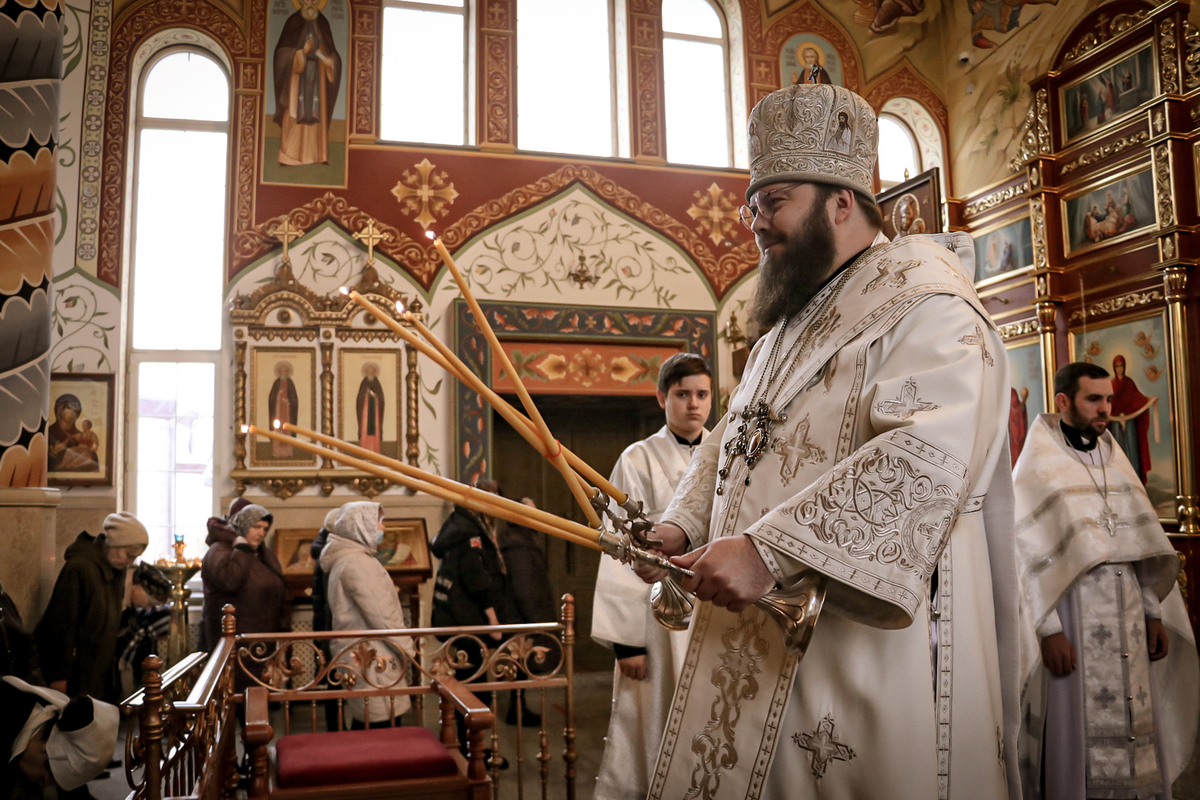 Его Преосвященству сослужили клирики собора: иерей Георгий Дворовой, иерей Илия Бойко.