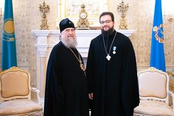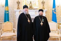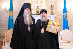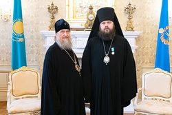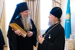 На память о визите в Казахстан и участии в значимом церковном праздновании Глава Митрополичьего округа удостоил архипастырей юбилейных медалей «150 лет Туркестанской епархии».