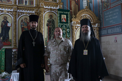 Затем состоялось знакомство епископа Савватия с ВрИО командира объединенной российской военной базы подполковником Куксой Александром Владимировичем и другим руководящим составом войсковой части.