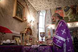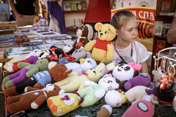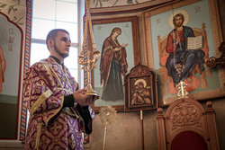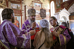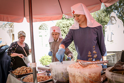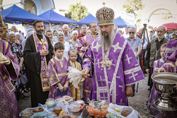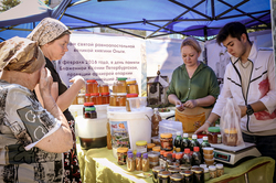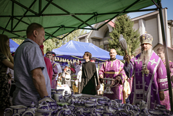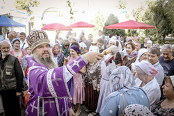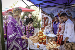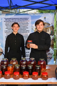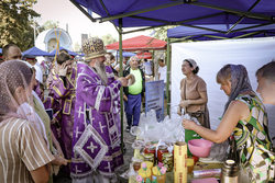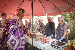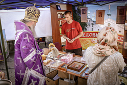 После ранней литургии епископ Савватий прочитал молитву на освящение меда, а затем, пройдя по палаткам окропил святой водой выставленный товар.