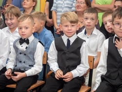 После молебна все участники праздника пошли в актовый зал. Под веселые детские и школьные песни, под аплодисменты родителей, ребята торжественно вошли в зал и заняли свои места в зале.