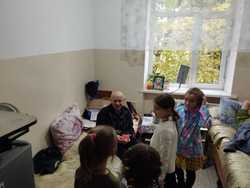 30 октября ребята с педагогами и своими родителями посетили городской дом престарелых. Дети порадовали мини-сценкой, песнями и частушками самую благодарную публику. После концерта гости самодельными открытками и небольшими сладкими угощениями поздравили сентябрьских и октябрьских именинников с днём рождения. Угощения получили также все зрители концерта. Все подопечные дома престарелых, были очень рады гостям.