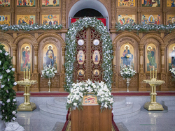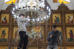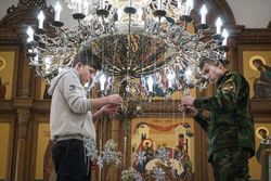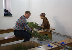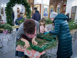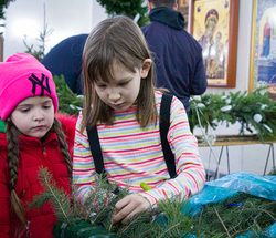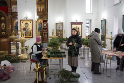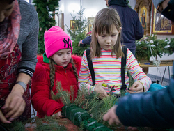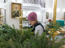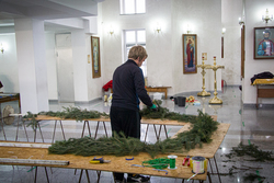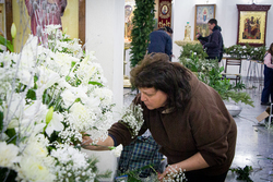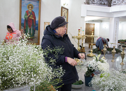 В этом году на помощь команде флористов пришли более 20 человек прихожан, деток с родителями, кадетов и работников собора. Прежде чем приступить к работе, участники прочитали совместную молитву перед началом всякого дела.