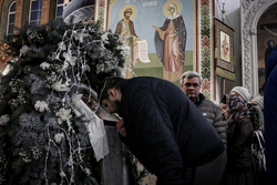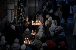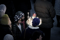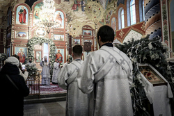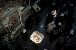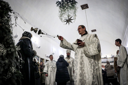 По окончании богослужения совершается славление - в центр храма выносится зажженная свеча, перед иконой праздника поется тропарь и кондак Рождеству Христову.