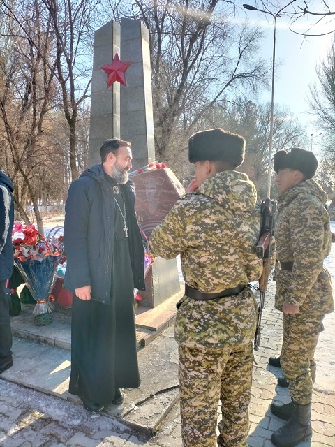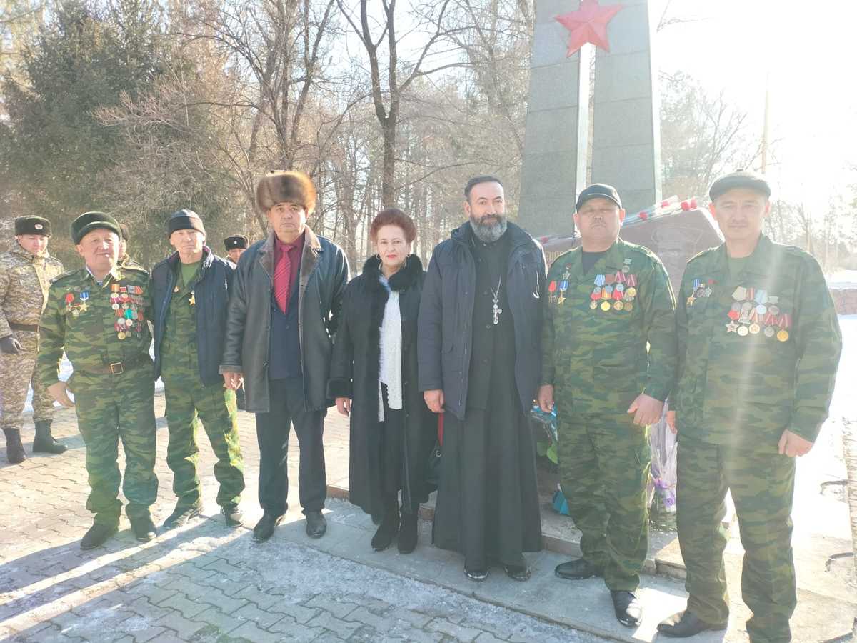 Затем, в 10 часов утра у памятника погибшим воинам- афганцам в г. Шопоков состоялось возложение цветов. Глава района Курбанбек Гайыпбекович поздравил собравшихся ветеранов с Днем памяти. Настоятелю храма Святого Духа с. Сокулук была предоставлена возможность поздравить ветеранов- афганцев и совершить заупокойную молитву по погибшим.После чего священник обратился к ветеранам с поздравлением.
