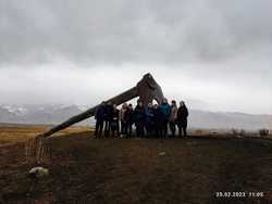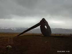 Проехав дальше по ущелью, мимо небольших сёл и посевных полей, увидели памятник Труду - огромный кетмень, лежащий посреди пахотной земли, как будто его здесь забыл Гулливер. Памятник очень впечатляет своей простотой и размерами.