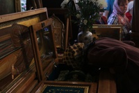 Мы открыли могилу, обнаружив в ней два гроба, крышки которых были вдавлены. Известно, что рядом с преподобным Ираклием был похоронен Сергей Бочарников, у которого святой жил последние годы своей жизни. В одном из гробов мы увидели остатки облачения – домотканное сукно с крестами, которые вышил сам преподобный. Также мы нашли деревянный крест, который обычно дается монаху в день пострига. На кресте отпечатались буквы разрешительной молитвы. Еще мы нашли небольшой пузырек с маслом от соборования. Очевидно, преподобный перед смертью, как и положено православному христианину, исповедался, причастился и пособоровался. Так мы поняли, в каком из гробов похоронен преподобный.