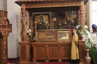 Сначала по благословению владыки Владимира мы привезли мощи в храм Архангела Михаила в селе Семеновка, где совершили молебен. Затем мощи были доставлены в алтарь Воскресенского кафедрального собора, где они пребывали до переноса в основную часть собора.
