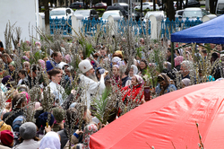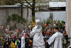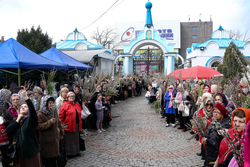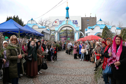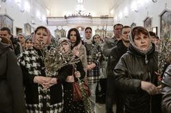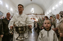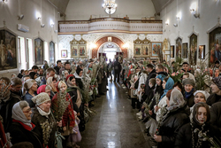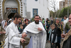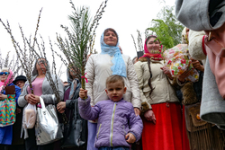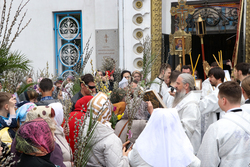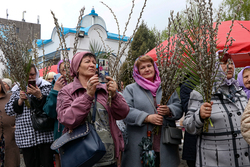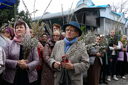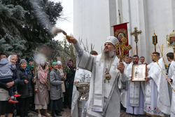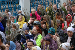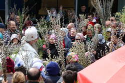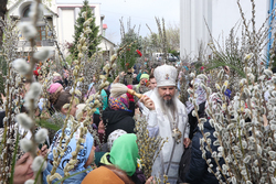 В завершение богослужения у иконы Входа Господня во Иерусалим было пропето славление празднику, совершен крестный ход, во время которого владыка освятил вербы.