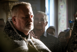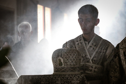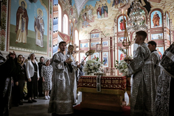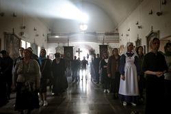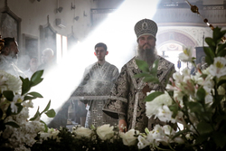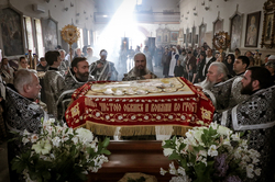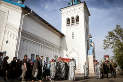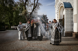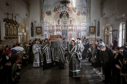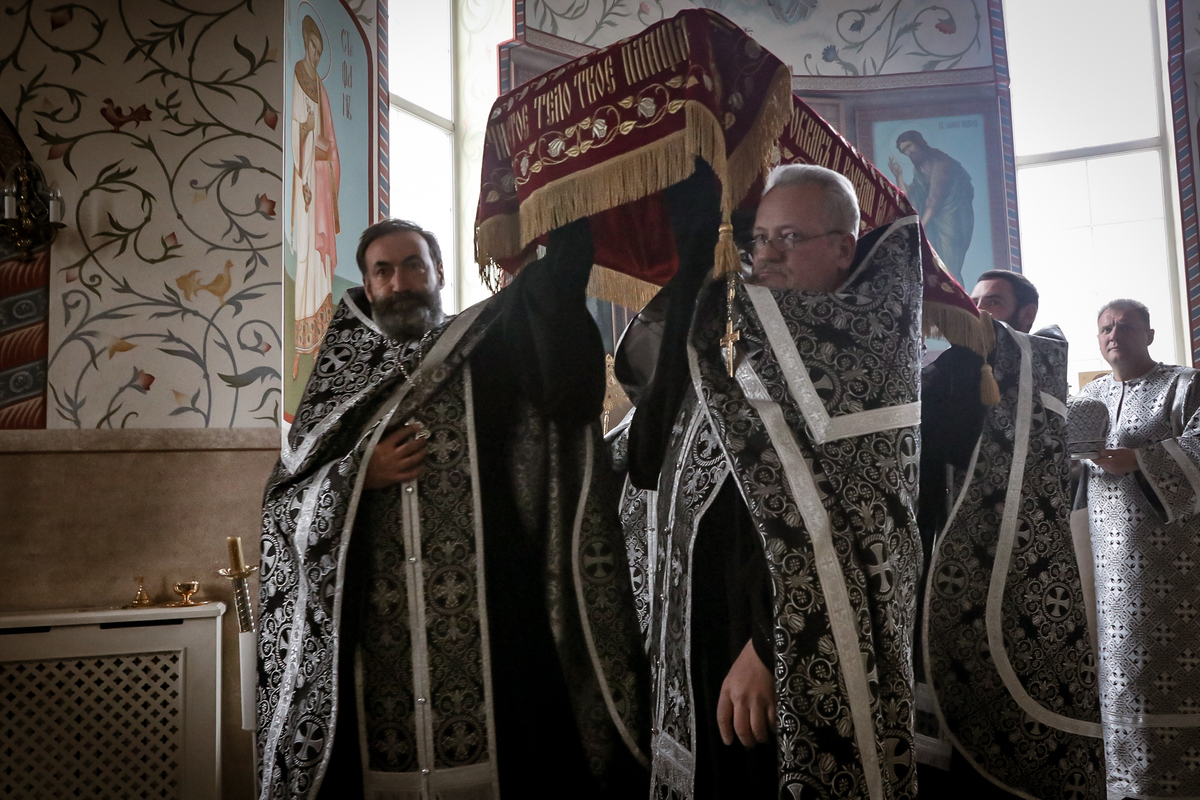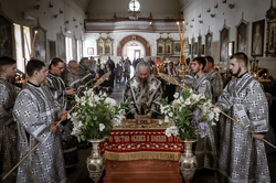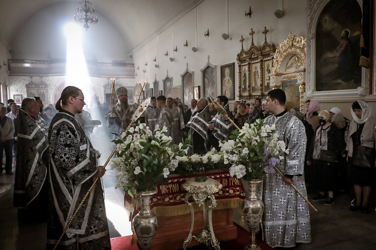 В завершение вечерни владыка Савватий и священнослужители вынесли из алтаря изображение положения Христа во гроб – святую Плащаницу. Вышитая пелена с иконой погребения Спасителя возложена на украшенной цветами гробнице в центре храма и будет находиться здесь до пасхальной утрени, напоминая этим трехдневное нахождение Господа Иисуса Христа во гробе.