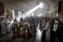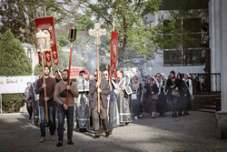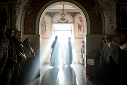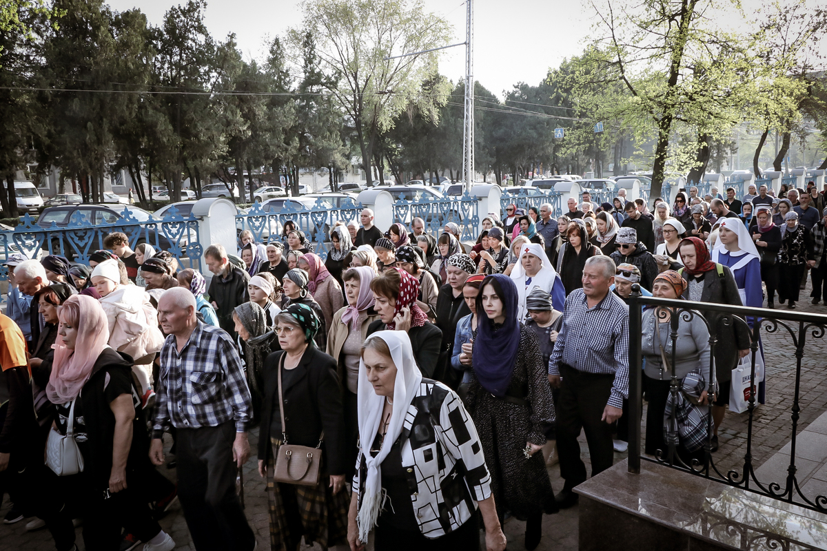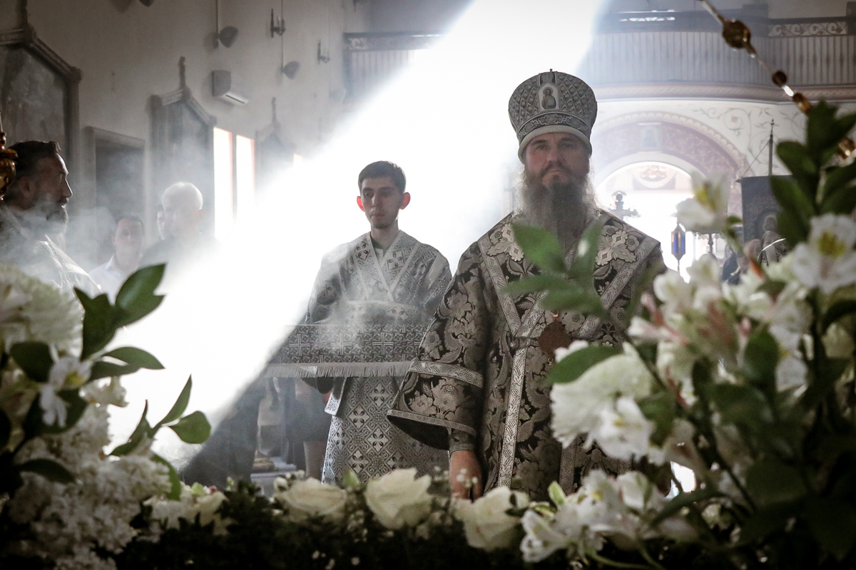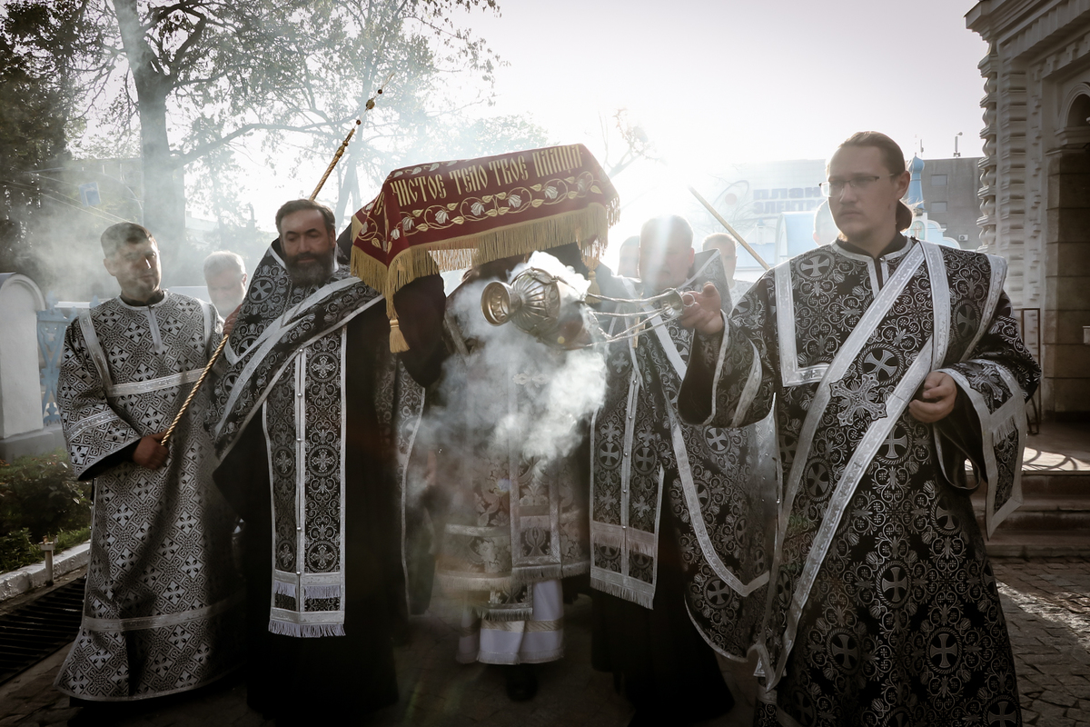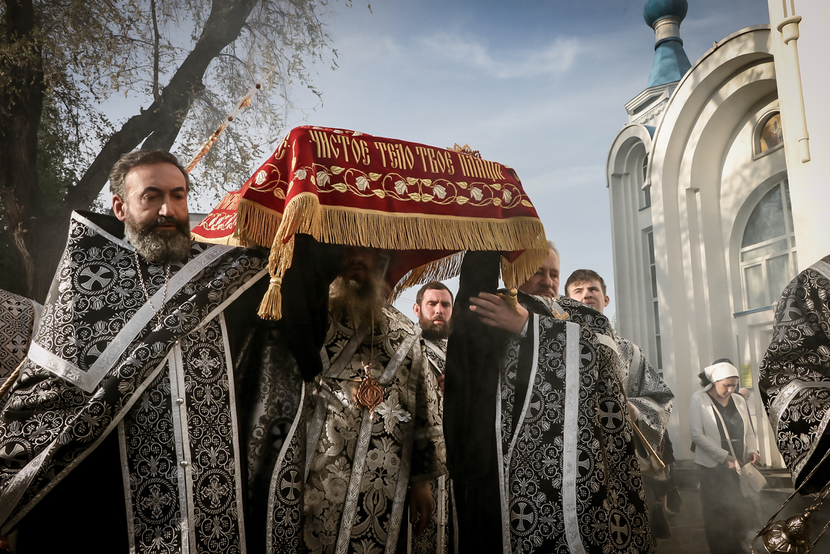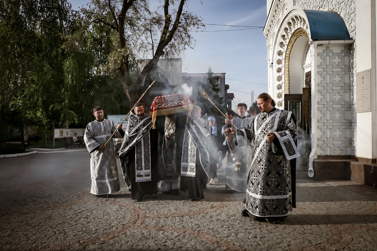 По окончании Великого славословия с пением «Святый Боже», под погребальный перезвон колоколов, Плащаница была обнесена крестным ходом вокруг собора.