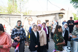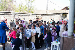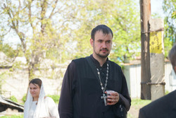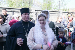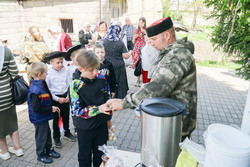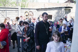 По окончании богослужения прихожане собрались на храмовой площади. К этому времени там уже стояли столы с угощениями. На столах расположились яркие яйца, ароматные куличи. В воздухе стоял аромат сдобы. Все угощения были приготовлены силами прихожан, сотрудников храма и казаков.
