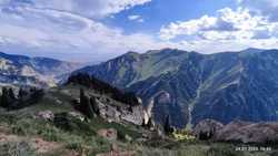 Нам предстоит спускаться, обогнув вершину красной горы со множеством разнообразных цветов, по очень крутому серпантину на склоне одной горы со скудной растительностью, и далее вдоль реки с густым хвойным лесом, который каким-то чудесным образом растёт на высоких и крутых скалах. От увиденного захватывает дух и чувство восторженной радости.