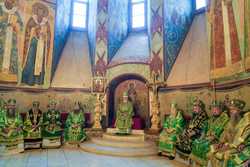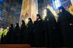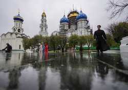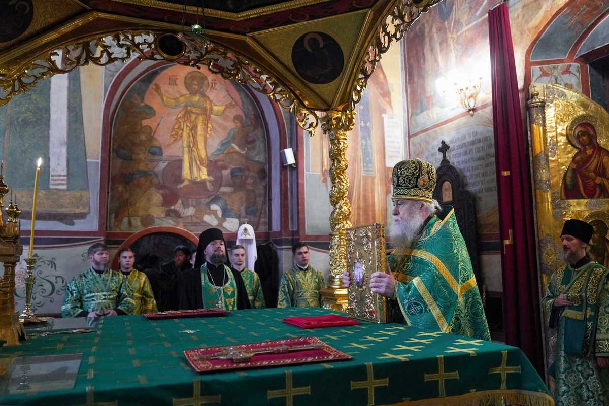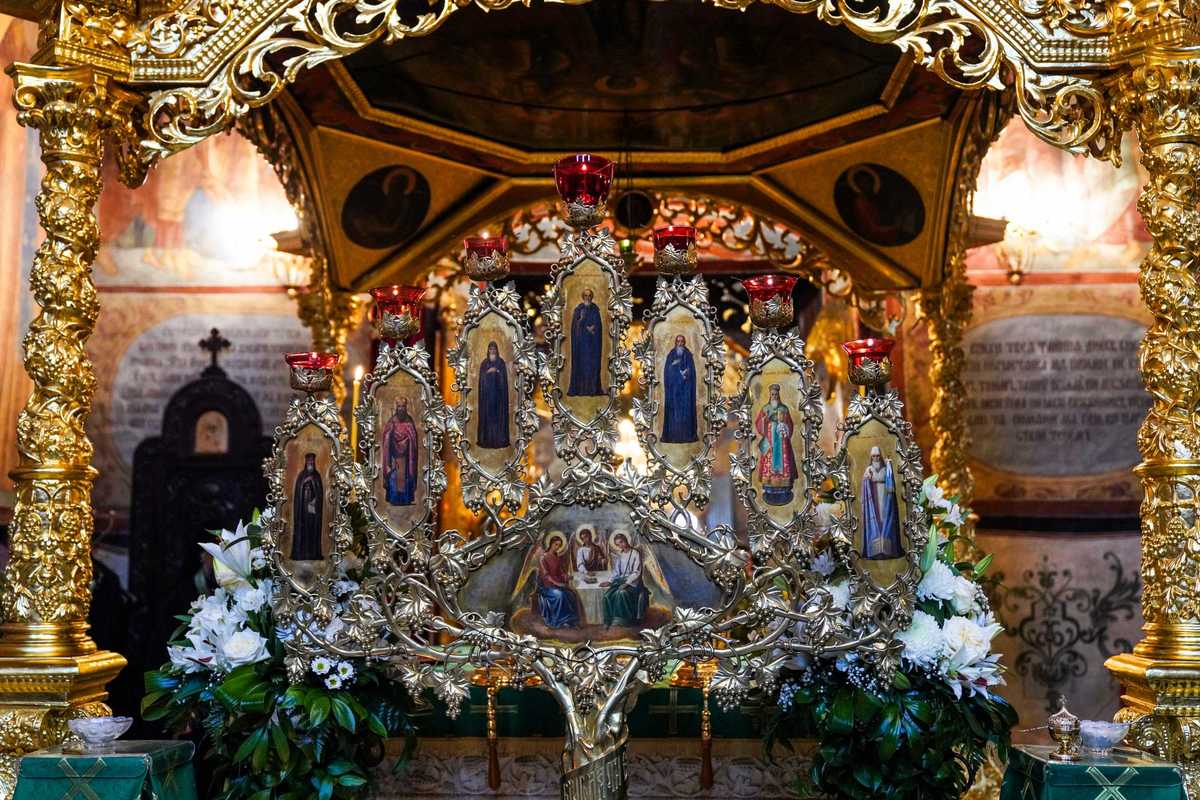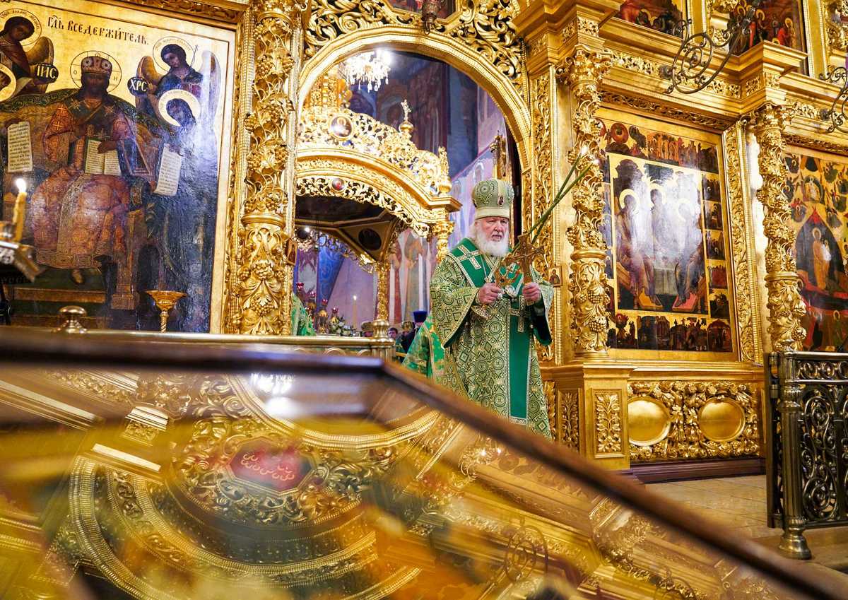 Затем Святейший Патриарх Кирилл поклонился мощам преподобного Сергия Радонежского в Троицком соборе, а также святыням Никоновского придела и Серапионовой палаты.