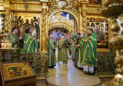 По окончании Литургии Святейший Патриарх Кирилл совершил в Успенском соборе молебен перед чтимой иконой преподобного Сергия Радонежского.