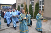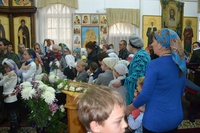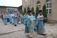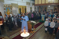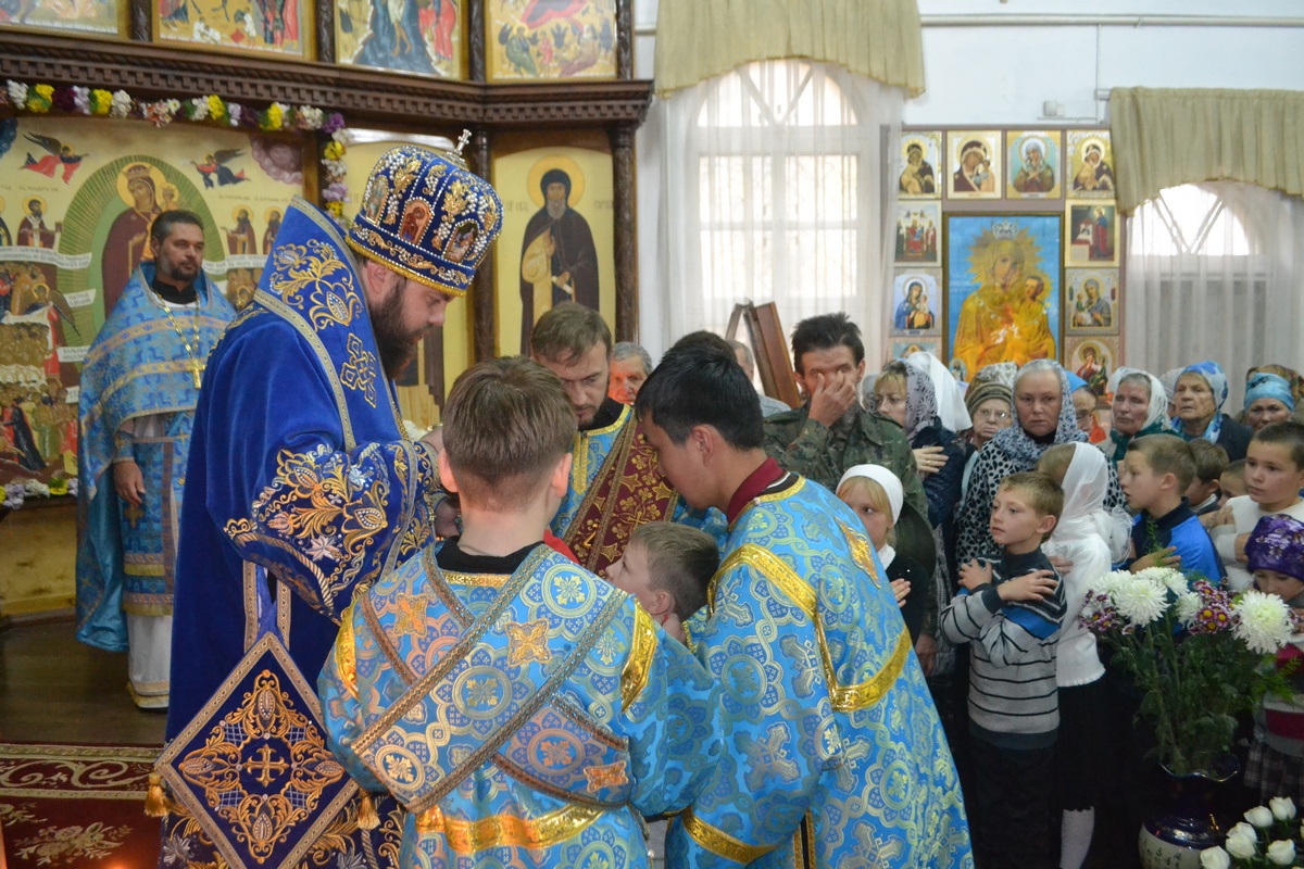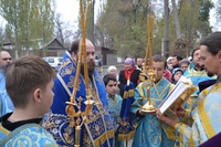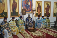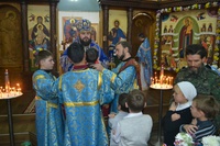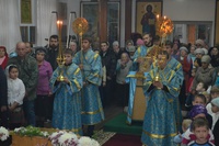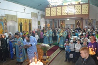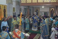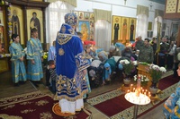 Его Преосвященству сослужили: настоятель храма иерей Василий Пименов, протоиерей Алексий Зайцев, протоиерей Андрей Борисенко, иерей Артемий Долотов, иерей Леонид Игнатов, иерей Георгий Дворовой. По окончании литургии был совершен Крестный ход вокруг храма.