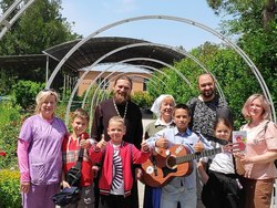 Воспитанники воскресной школы собора с воодушевлением пели песни под гитару. Слушатели с любовью и радостью внимали искренности юных дарований.