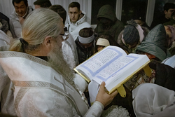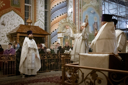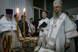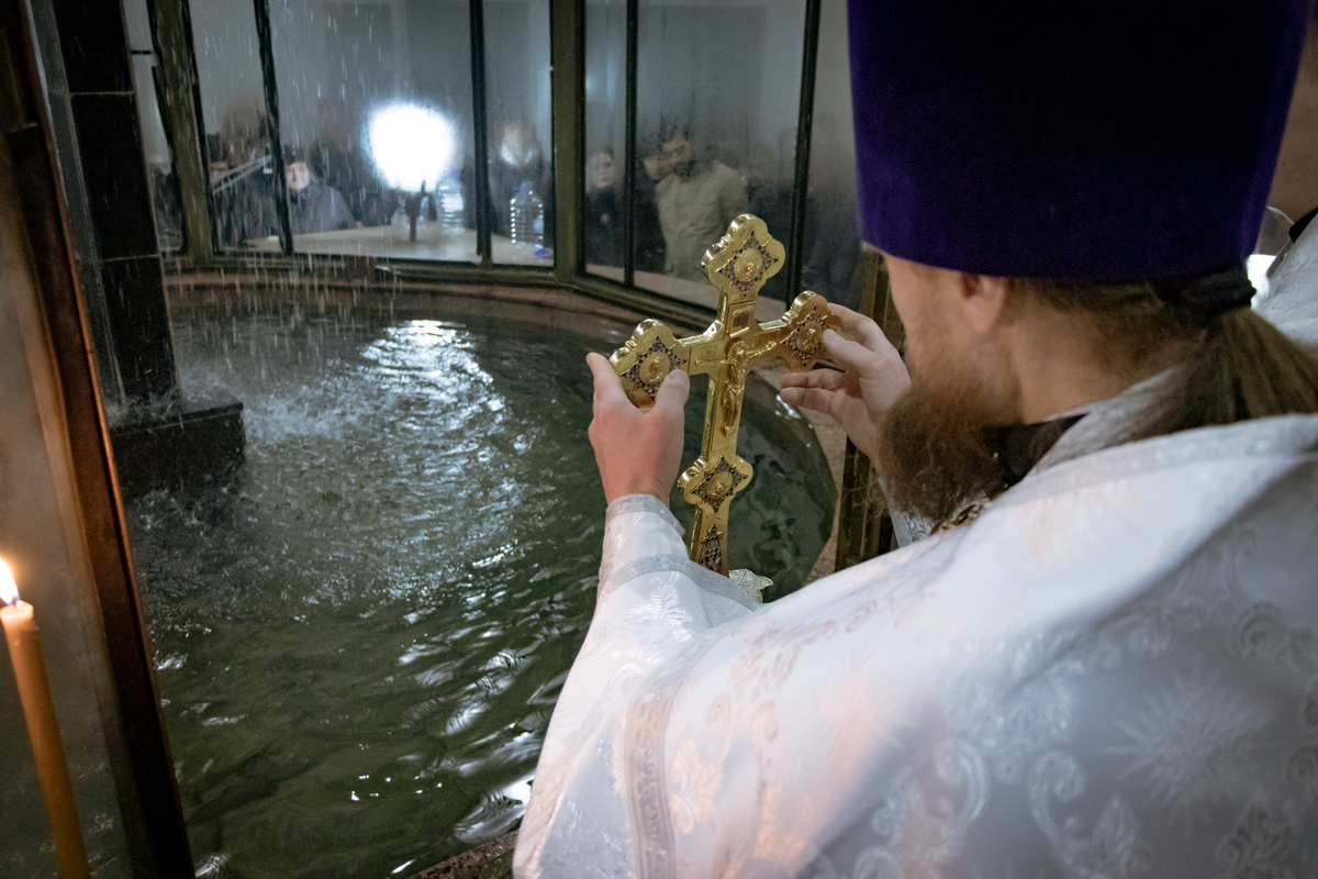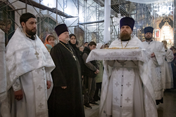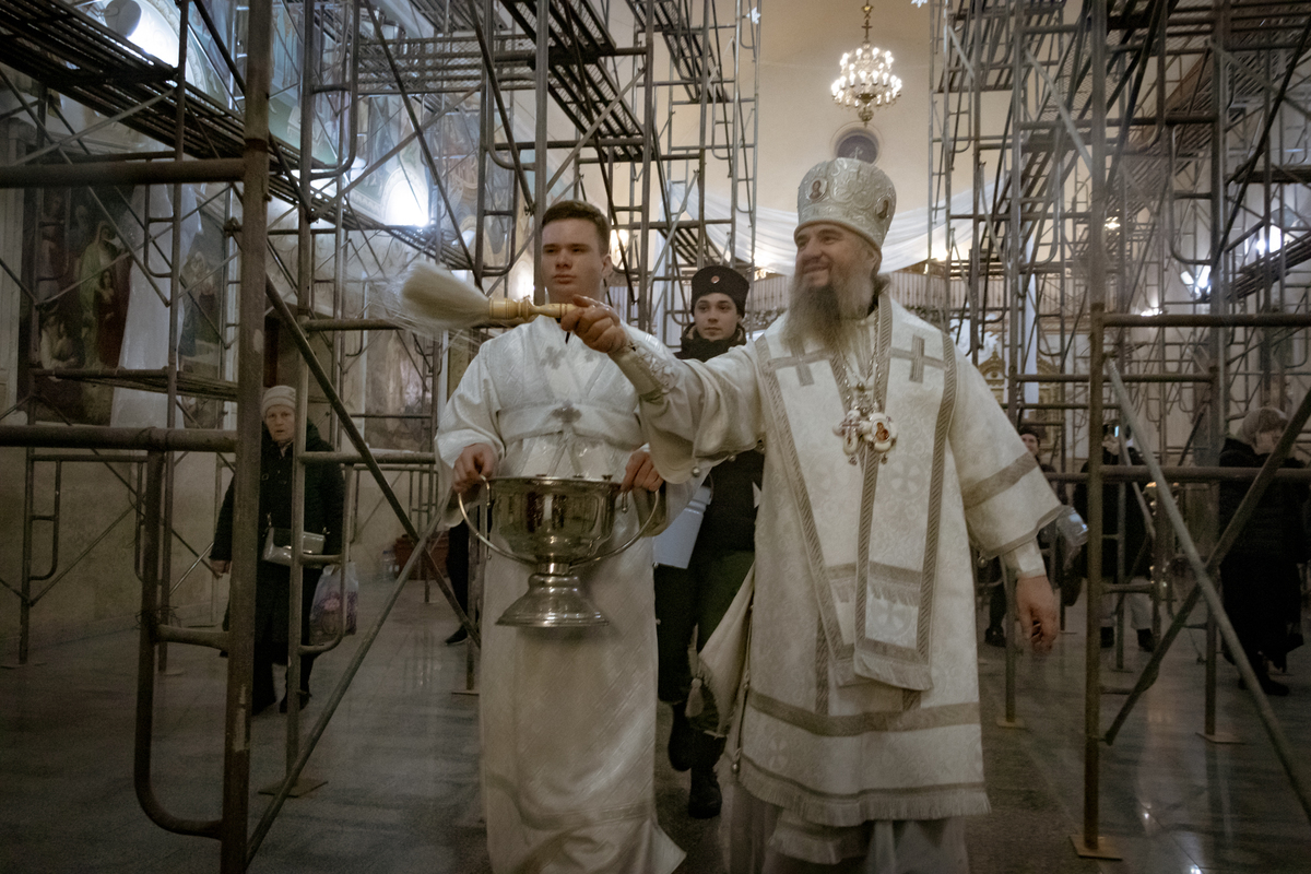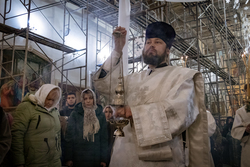 После литургии епископ Савватий совершил чин Великого освящения воды на иордани, устроенной на восточной части территории Свято-Воскресенского кафедрального собора.