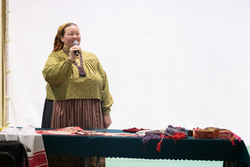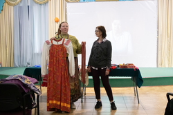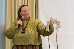 Семинар начался с показа фрагмента документального фильма «Русская культура. История подмены», а затем перешёл в формат живого погружения. Елена Чешегорова рассказывала о региональных традициях пошива и носки костюма, какие ткани использовались, как они драпировались, зачем носили много слоёв, как одевалась невеста, как надевался повойник. Оказалось, что каждая деталь – не просто украшение, а символ, знак, и даже молитва.