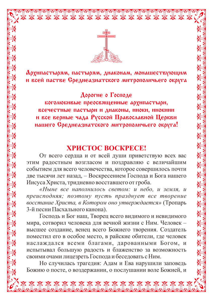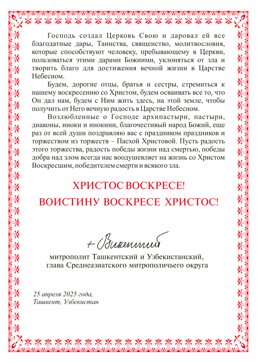 Пасхальное послание главы Среднеазиатского митрополичьего округа митрополита Ташкентского и Узбекистанского Викентия