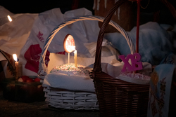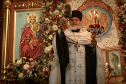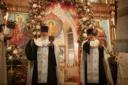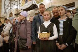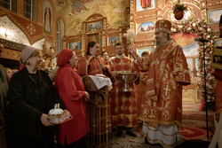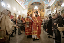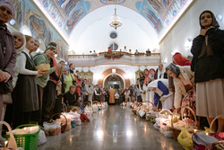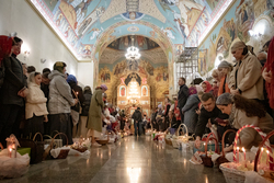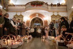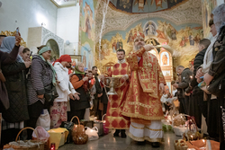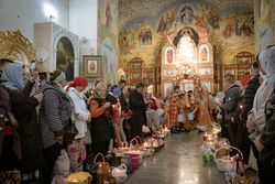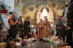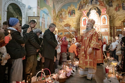 Затем владыка освятил артосы, а после окончания богослужения обратился ко всем собравшимся со словами пасхального приветствия, после чего благословил пасхальную трапезу.