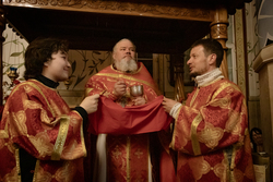 Во время пения пасхальных часов священнослужители сменили белые облачения на красные.