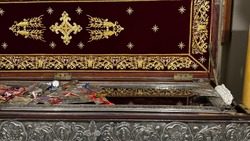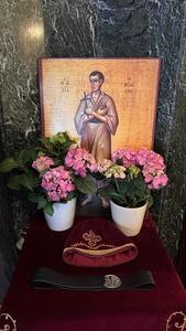 Катер с монахами привез святыни Афона, включая частицы креста Господня и мощи святых Василия Великого, Георгия Победоносца, Пантелеимона Целителя и св. Марины, которые были переданы паломникам с благоговением.