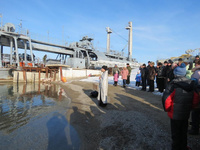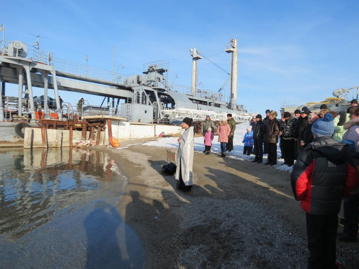 В отличие от купания на авиабазе, на территории базы ВМФ вместо палаток использовались автобусы для переодевания, а для освящения крещенской воды вместо баков использовалась пожарная машина.