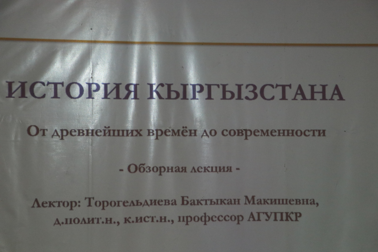 Лекция охватила основные этапы истории Кыргызстана, показывая, как на территории страны формировались культурные традиции и складывались судьбы народов. В древнейшем периоде были обозначены первые следы человека на этих землях, прозвучала тема ранних письменных упоминаний этнонима «кыргыз» в китайских источниках.