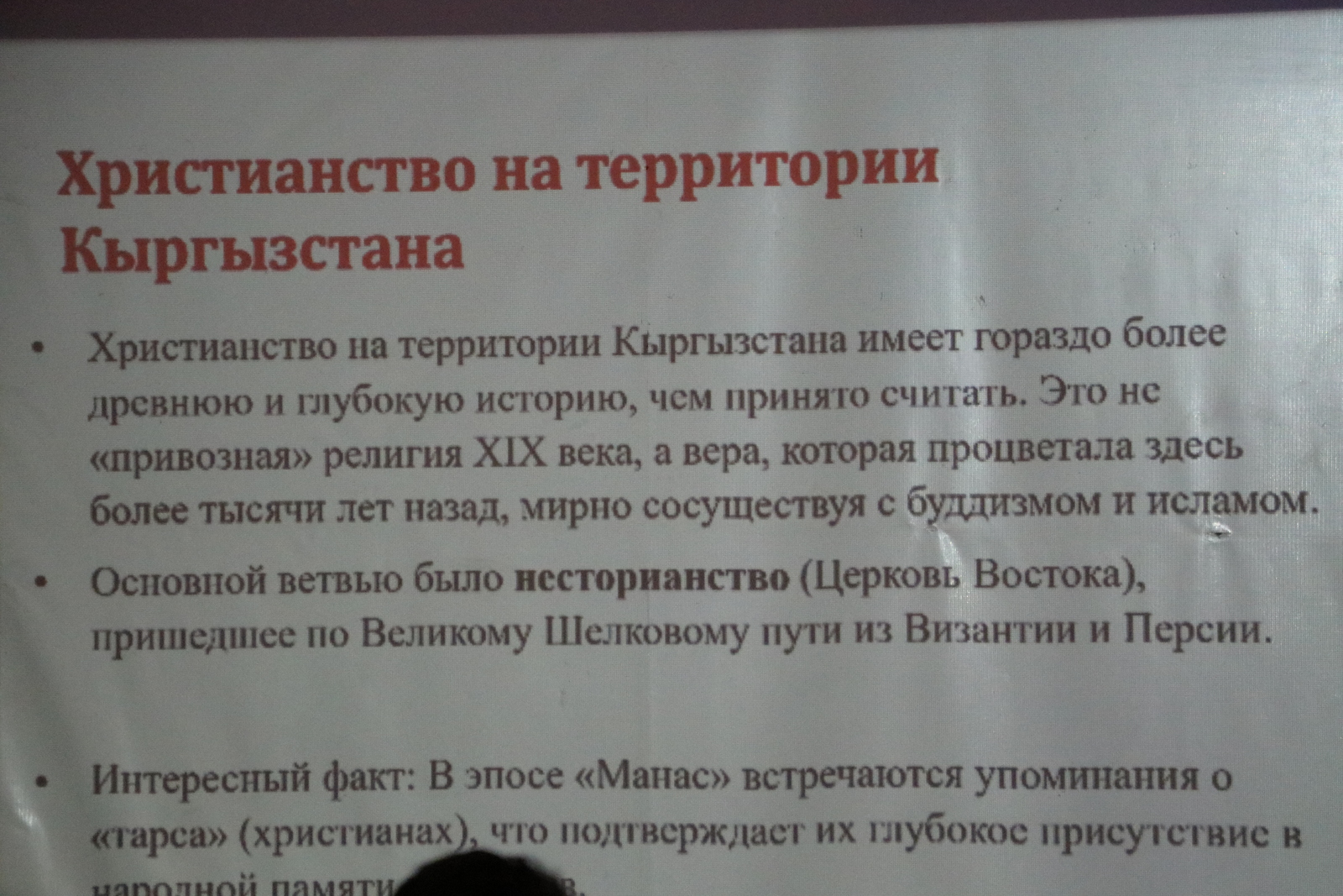 Далее речь шла о тюркском периоде и роли городских центров Чуйской долины – Суяб, Баласагун, Навекат, связанных с Великим шелковым путем. Рассматривался христианский период на территории Кыргызстана, который имеет древнюю историю. Основной ветвью было несторианство (Церковь Востока), пришедшее по Великому Шелковому пути. Были отмечены культурные достижения Караханидской эпохи и имена Юсуфа Баласагуни и Махмуда Кашгари, а также памятники архитектуры, ставшие символами исторической памяти.