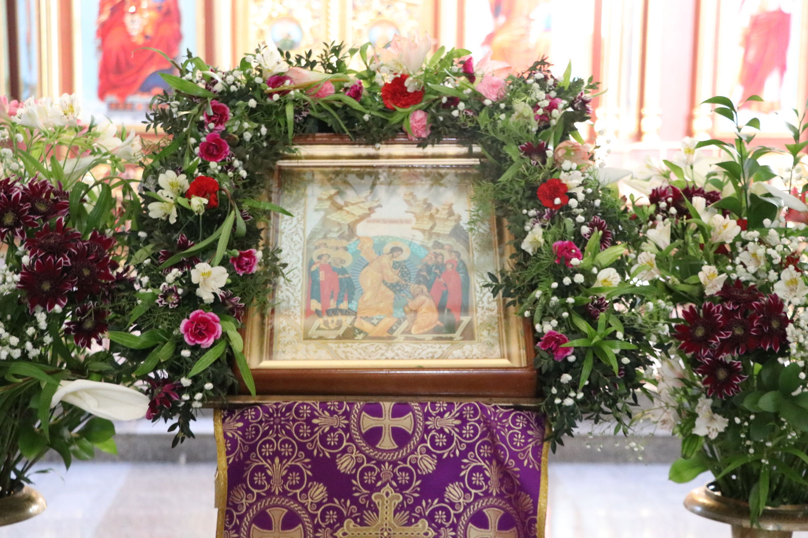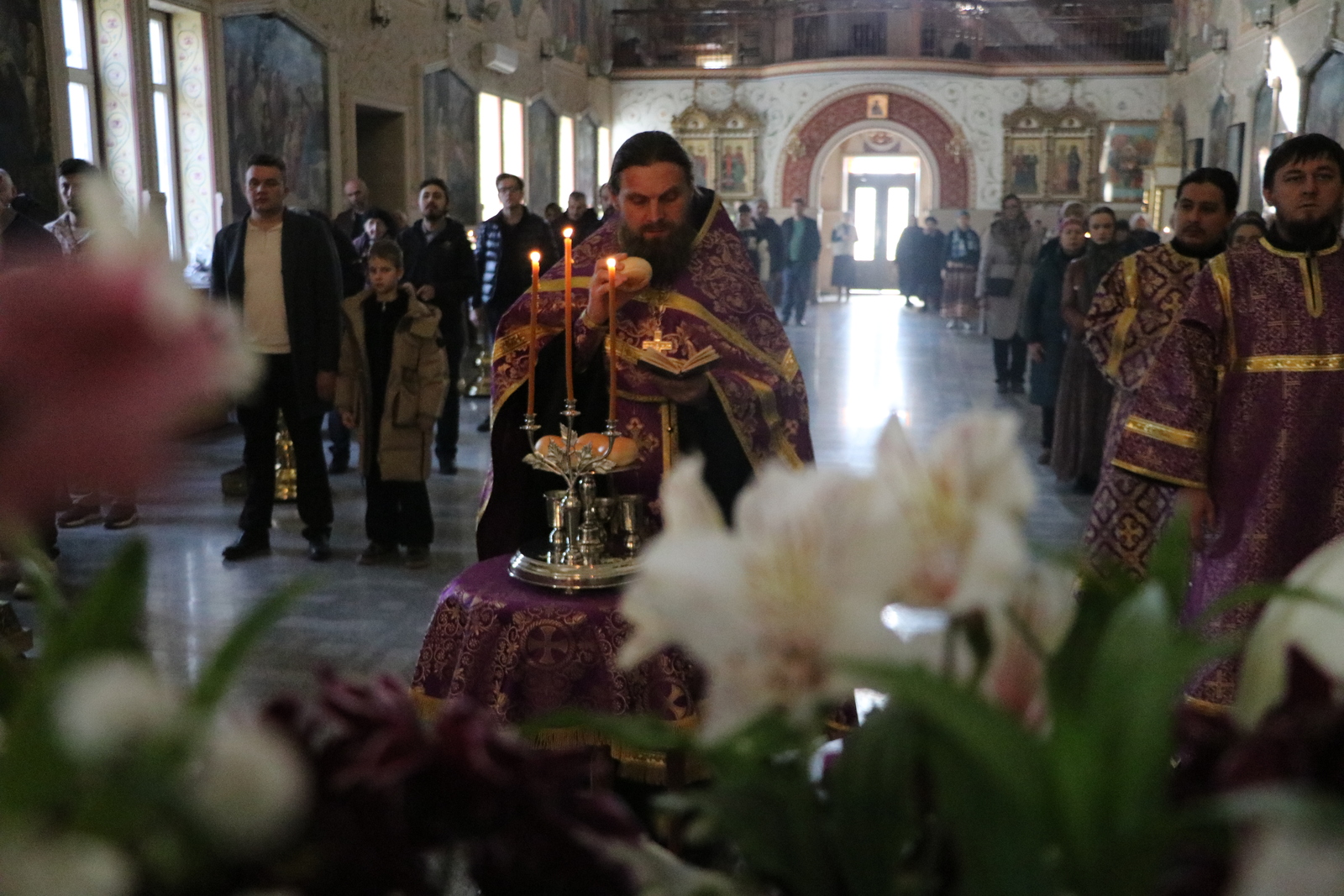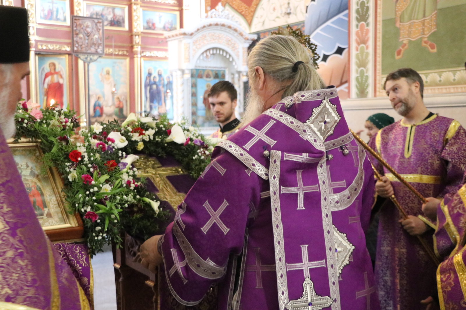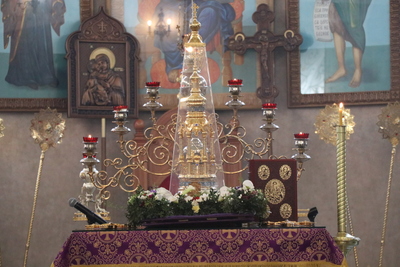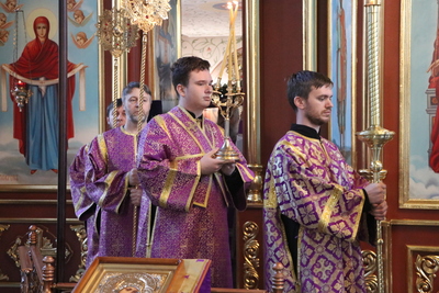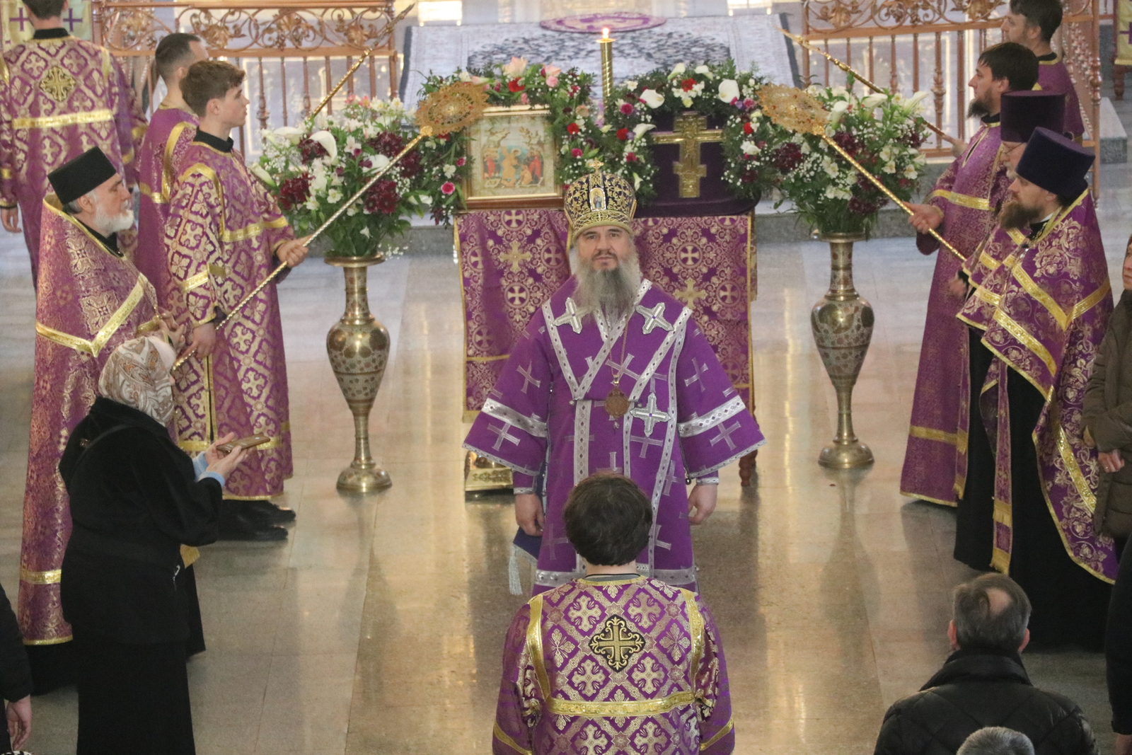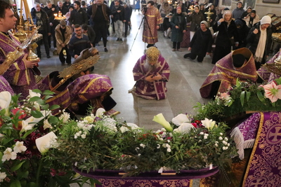 Главным моментом богослужения стал вынос Животворящего Креста. После пения великого славословия архипастырь вынес из алтаря украшенный цветами Крест Господень и установил его на середине храма для поклонения верующих.