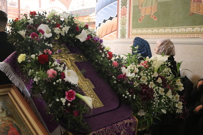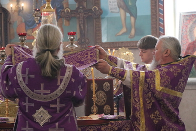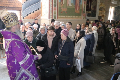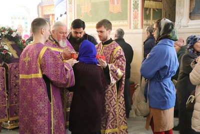 По завершении Божественной литургии духовенство и прихожане совершили поклонение Животворящему Кресту, который будет находится в центре храма в течение всей Крестопоклонной недели.