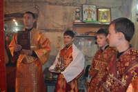 Его Преосвященство возглавил Божественную литургию. Ему сослужили: иерей Артемий Долотов, настоятель храма святых мучеников благоверных князей Бориса и Глеба, архидиакон Антоний Шабалин и протодиакон Сергий Черкашин.