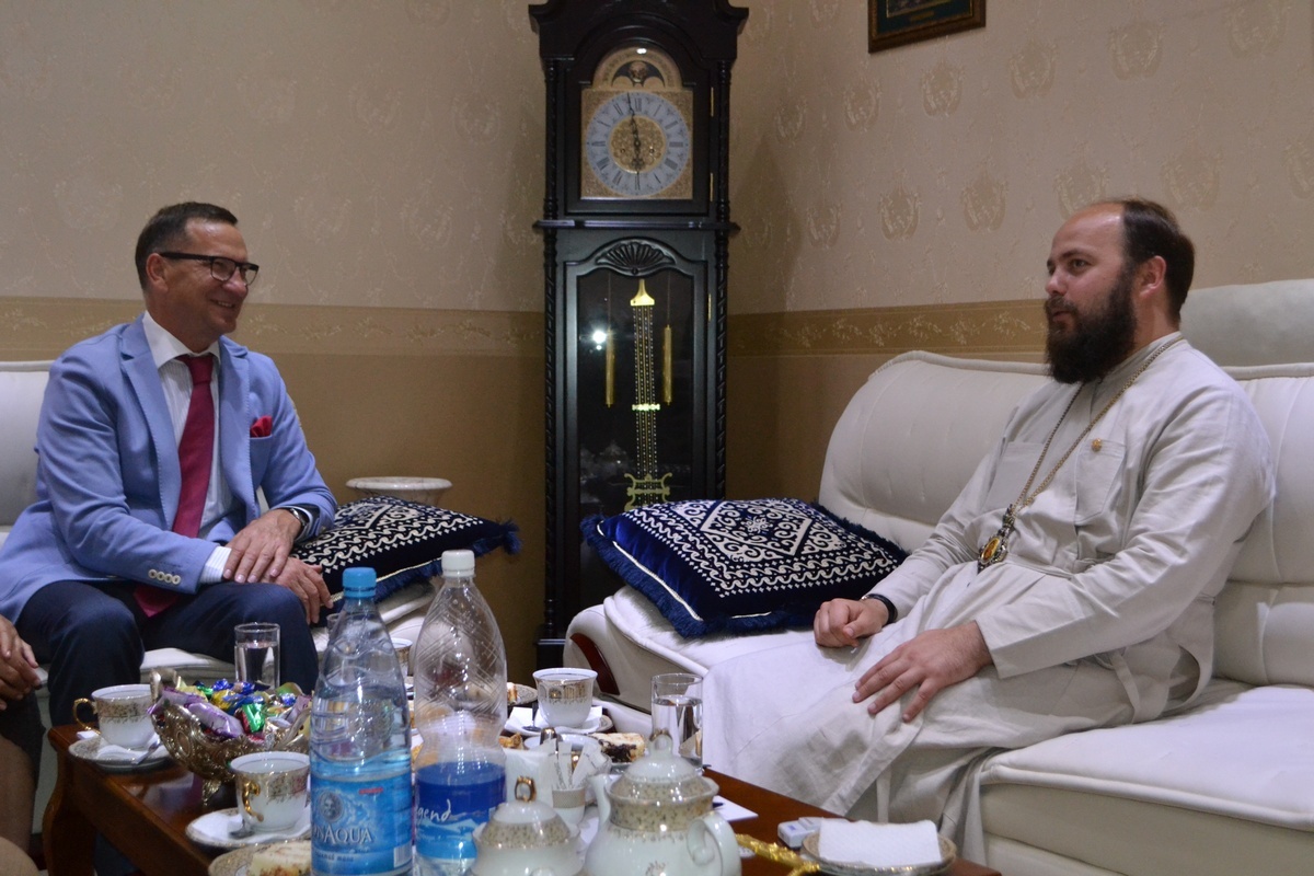 В ходе беседы, за чаепитием, владыка Даниил ознакомил гостей с разносторонней деятельностью Бишкекской епархии в сфере образовательных, социальных и молодежных инициатив, рассказал об этапах строительства Владимирского храма и реконструкции Свято-Воскресенского собора.